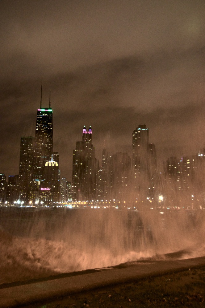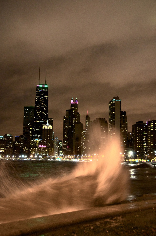 Steady north winds peaking at 50 knots generated huge waves yesterday. The city closed miles of the lakefront bike path, and the park district deployed vans to discourage gawkers from getting too close to the water. The marine forecast promised waves of 15 to 20 feet . We got just close enough to get these after-dark shots.