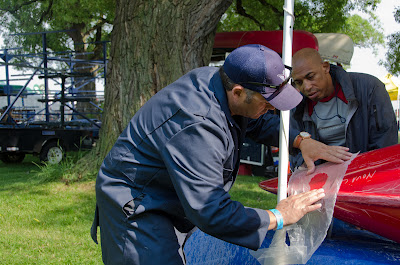 …and even learn how to fix a damaged hull. Here, Roch Prevost, sales and marketing manager of Nova Craft Canoe, demonstrates boat repair techniques.