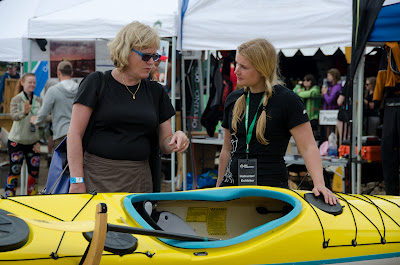 …paddle demo boats (here, Liz Burnside, who organized the first MEC Toronto Paddlefest in 2005 and continues to put her all into it, answers questions about the P&H Cetus)…
