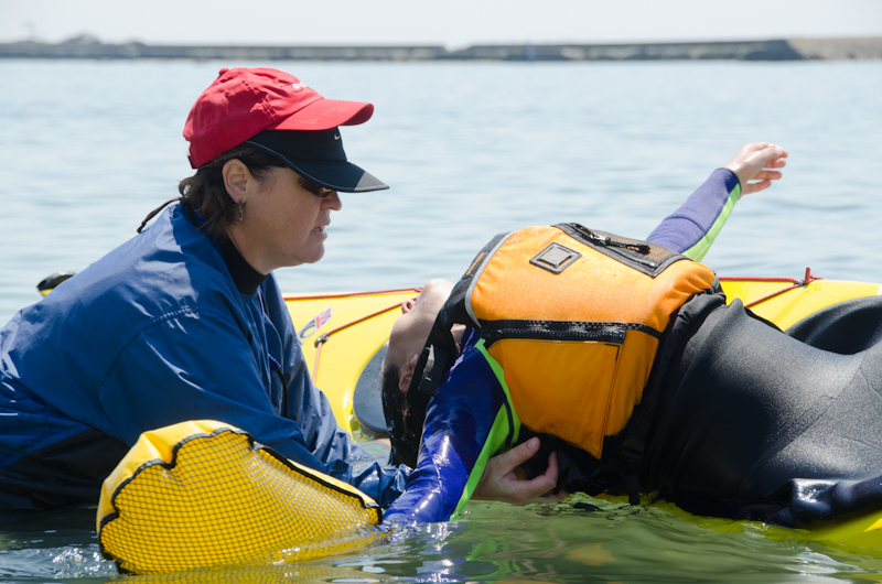 Participants can take four 90-minute, on-water clinics per day (here, Birgit Kuhle teaches a student to roll)…